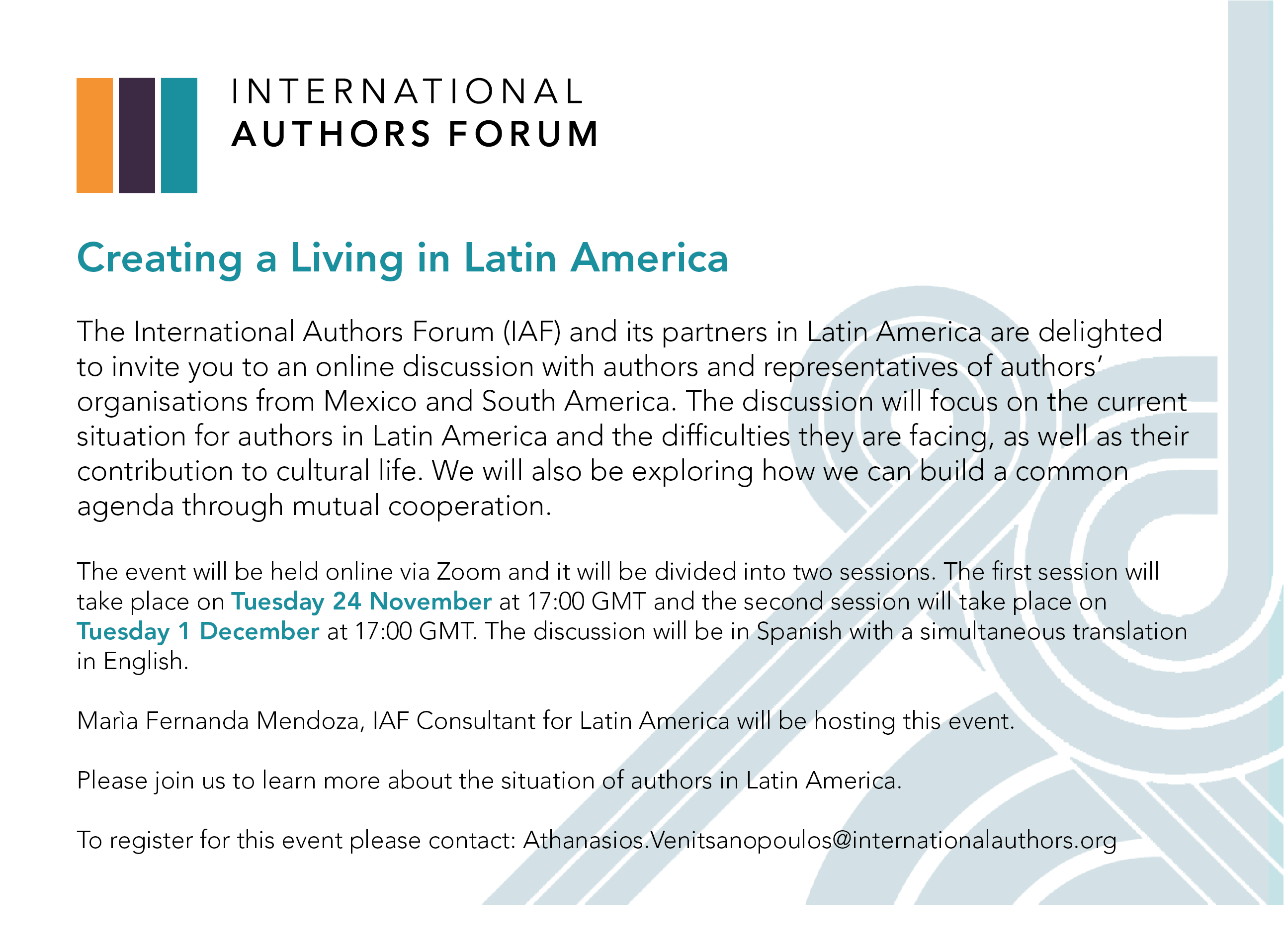 The International Authors Forum (IAF) and its partners in Latin America are delighted to invite you to an online discussion with authors and representatives of authors’ organisations from Latin America and Mexico.
