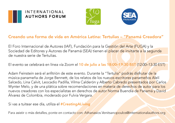The International Authors Forum (IAF) in partnership with the Foundation for Arts Development (FUGA) and the Society of Publishers and Authors in Panama (SEA) is delighted to invite you to the second in our series of Tertulias. ”Tertulia” is the name for a type of meeting which took place historically in Latin America, in which artists gathered to share their work, discuss political matters, create solidarity and take action.