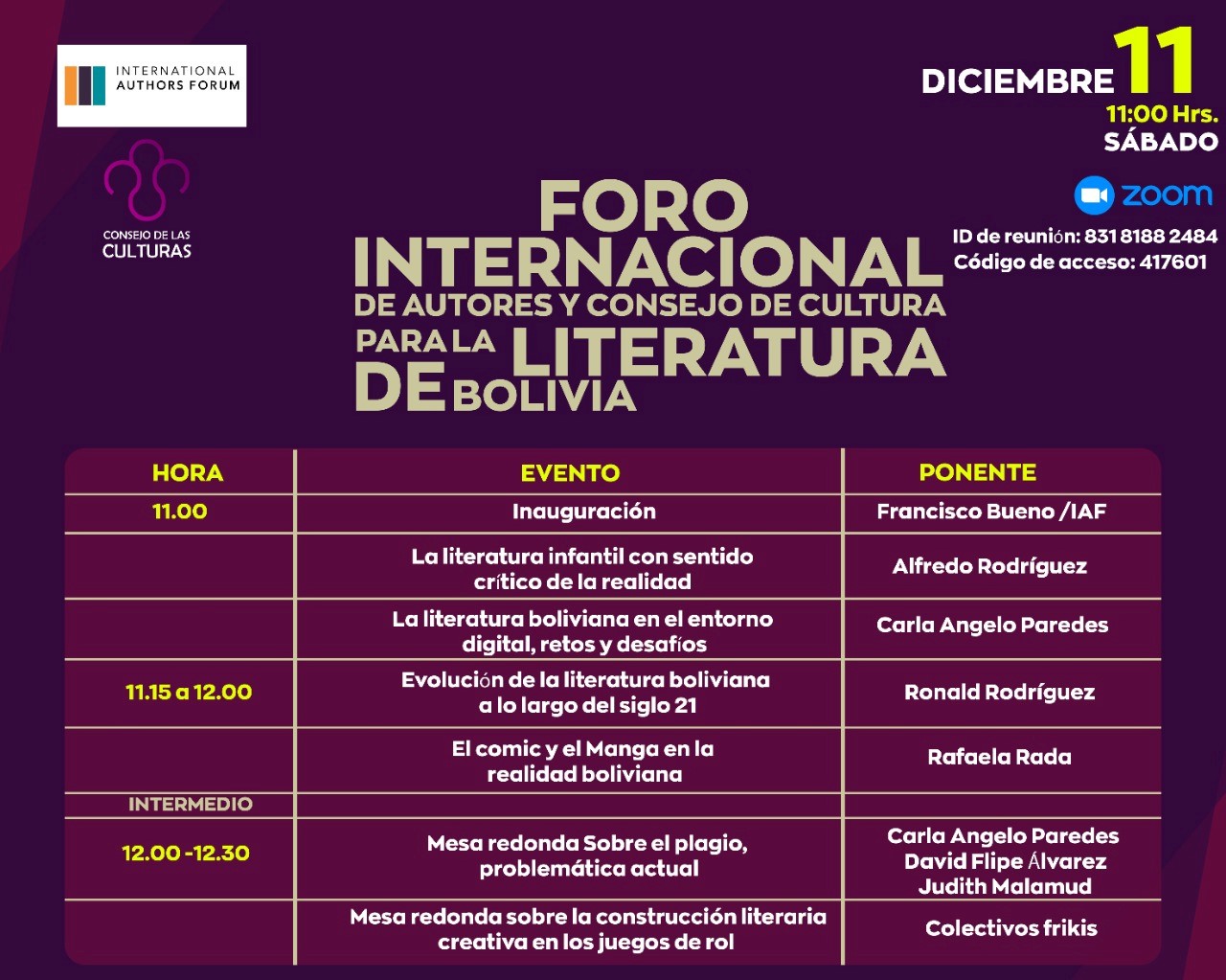 The International Authors Forum and the Cultural Council from Bolivia are delighted to invite you to the Tertulia “Between the creation and the respect, a walk through Bolivians letters”, within the framework of the Bolivian Book Fair.